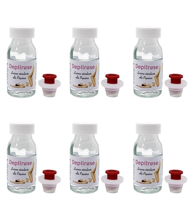 La lotion retardatrice Depilrose 10 ml à la papaïne. c'est le complément idéal du traitement dépilatoire à la cire brésilienne Depilrose. Grâce à l'action de la papaïne lyophilisée, il pénètre dans le follicule en inhibant temporairement la formation des nouveaux cheveux, prolongeant ainsi l'efficacité du traitement dépilatoire Depilrose.